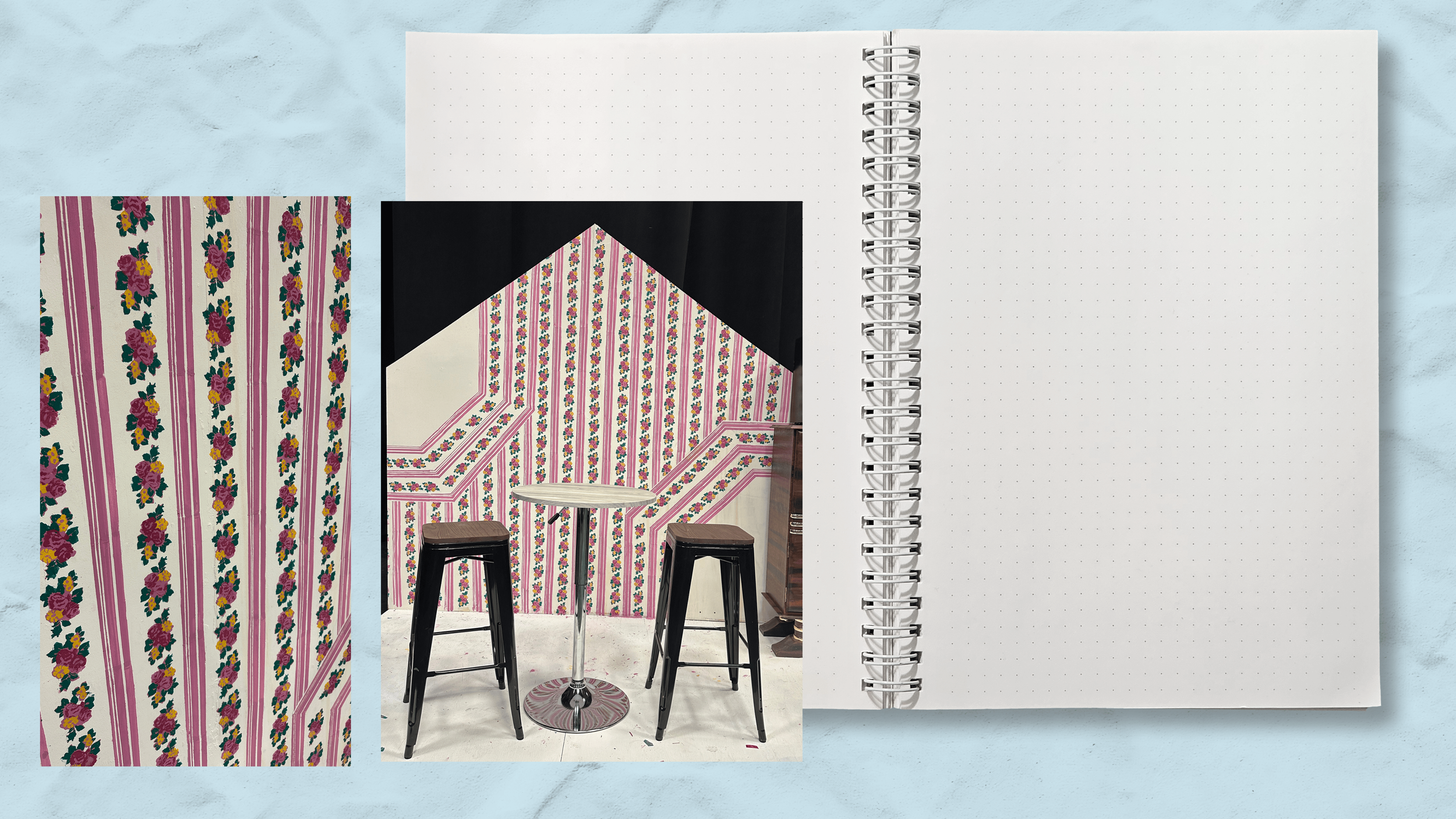 After using my iPad to draw out the designer’s requests for the wallpaper, I used my Cricut to cut stencils out of vinyl for the wallpaper. Once the florals were complete, I topped it off with a yellowish wash.